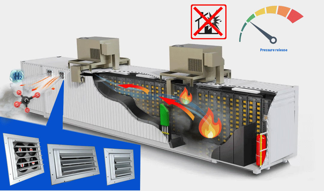 Equipped with our pressure relief shutterrs, they will automatically open according to the emergency situation you have set. Through the exhaust fan inside the structure, the combustible gases and thick smoke inside the energy container will be quickly expelled from the equipment. And it can reduce temperature and expansion pressure, avoiding the occurrence of equipment explosions
